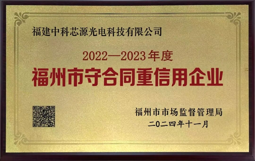 近日,福州市市场监督管理局发布关于公示“2022—2023年度福州市守合同重信用企业”的公告,福建中科芯源光电科技有限公司榜上有名,获评“2022-2023年度福州市守合同重信用企业”。